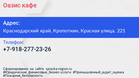 Оазис, кафе по адресу Краснодарский край, Кропоткин, Красная улица, 221 в дальнейшем Организация, размещена в следующих категориях: