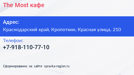 The Most, кафе по адресу Краснодарский край, Кропоткин, Красная улица, 210 в дальнейшем Организация, размещена в следующих категориях: