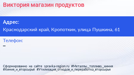 Виктория, магазин продуктов по адресу Краснодарский край, Кропоткин, улица Пушкина, 61 в дальнейшем Организация, размещена в следующих категориях: