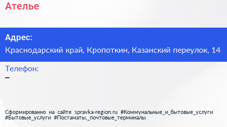 Ателье по адресу Краснодарский край, Кропоткин, Казанский переулок, 14 в дальнейшем Организация, размещена в следующих категориях: