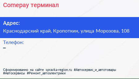 Comepay, терминал по адресу Краснодарский край, Кропоткин, улица Морозова, 108 в дальнейшем Организация, размещена в следующих категориях: