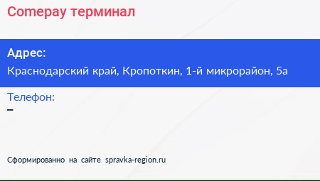 Comepay, терминал по адресу Краснодарский край, Кропоткин, 1-й микрорайон, 5а в дальнейшем Организация, размещена в следующих категориях: