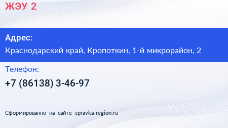 ЖЭУ №2 по адресу Краснодарский край, Кропоткин, 1-й микрорайон, 2 в дальнейшем Организация, размещена в следующих категориях: