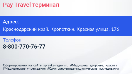 Pay.Travel, терминал по адресу Краснодарский край, Кропоткин, Красная улица, 176 в дальнейшем Организация, размещена в следующих категориях: