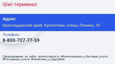 Qiwi, терминал по адресу Краснодарский край, Кропоткин, улица Ленина, 45 в дальнейшем Организация, размещена в следующих категориях: