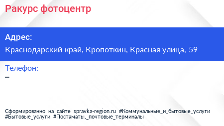Ракурс, фотоцентр по адресу Краснодарский край, Кропоткин, Красная улица, 59 в дальнейшем Организация, размещена в следующих категориях: