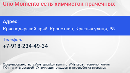 Uno Momento, сеть химчисток-прачечных по адресу Краснодарский край, Кропоткин, Красная улица, 98 в дальнейшем Организация, размещена в следующих категориях: