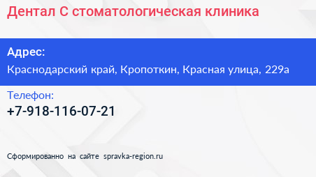 Дентал-С, стоматологическая клиника по адресу Краснодарский край, Кропоткин, Красная улица, 229а в дальнейшем Организация, размещена в следующих категориях: