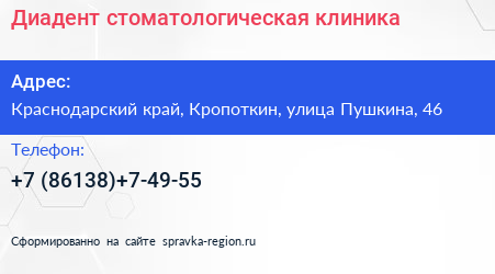 Диадент, стоматологическая клиника по адресу Краснодарский край, Кропоткин, улица Пушкина, 46 в дальнейшем Организация, размещена в следующих категориях: