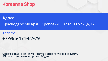 Koreanna Shop по адресу Краснодарский край, Кропоткин, Красная улица, 66 в дальнейшем Организация, размещена в следующих категориях: