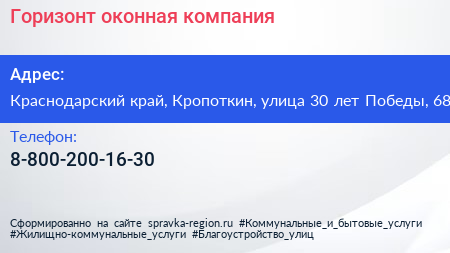 Горизонт, оконная компания по адресу Краснодарский край, Кропоткин, улица 30 лет Победы, 68 в дальнейшем Организация, размещена в следующих категориях: