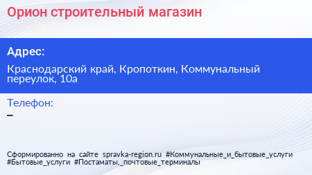 Орион, строительный магазин по адресу Краснодарский край, Кропоткин, Коммунальный переулок, 10а в дальнейшем Организация, размещена в следующих категориях: