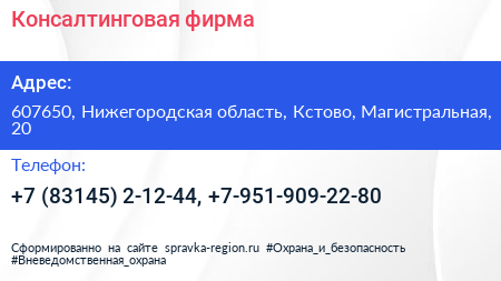 Консалтинговая фирма по адресу 607650, Нижегородская область, Кстово, Магистральная, 20 в дальнейшем Организация, размещена в следующих категориях:
