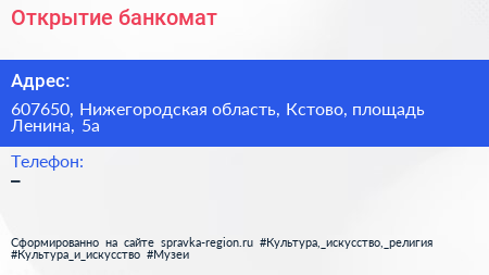 Открытие, банкомат по адресу 607650, Нижегородская область, Кстово, площадь Ленина, 5а в дальнейшем Организация, размещена в следующих категориях: