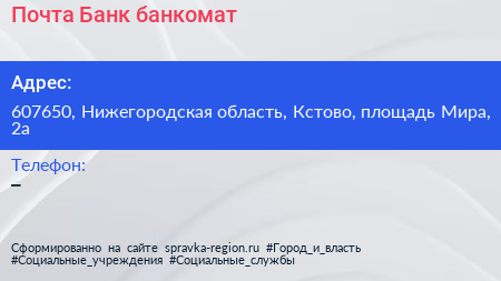 Почта Банк, банкомат по адресу 607650, Нижегородская область, Кстово, площадь Мира, 2а в дальнейшем Организация, размещена в следующих категориях: