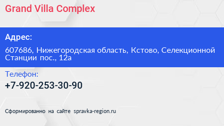 Grand Villa Complex по адресу 607686, Нижегородская область, Кстово, Селекционной Станции пос., 12а в дальнейшем Организация, размещена в следующих категориях: