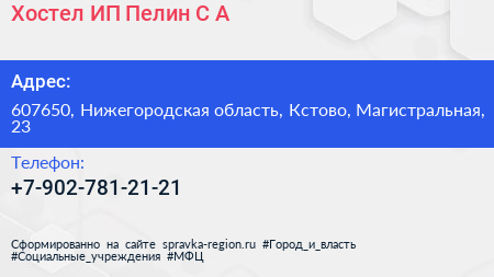 Хостел, ИП Пелин С.А. по адресу 607650, Нижегородская область, Кстово, Магистральная, 23 в дальнейшем Организация, размещена в следующих категориях: