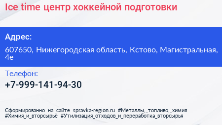 Ice-time, центр хоккейной подготовки по адресу 607650, Нижегородская область, Кстово, Магистральная, 4е в дальнейшем Организация, размещена в следующих категориях: