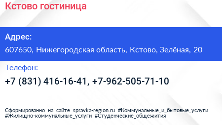 Кстово, гостиница по адресу 607650, Нижегородская область, Кстово, Зелёная, 20 в дальнейшем Организация, размещена в следующих категориях: