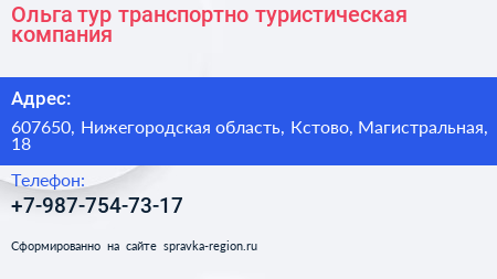 Ольга-тур, транспортно-туристическая компания по адресу 607650, Нижегородская область, Кстово, Магистральная, 18 в дальнейшем Организация, размещена в следующих категориях: