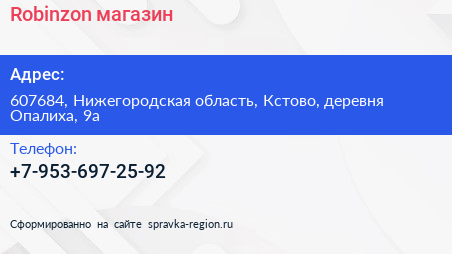 Robinzon, магазин по адресу 607684, Нижегородская область, Кстово, деревня Опалиха, 9а в дальнейшем Организация, размещена в следующих категориях: