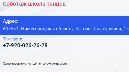 Саботаж, школа танцев по адресу 607651, Нижегородская область, Кстово, Талалушкина, 15 в дальнейшем Организация, размещена в следующих категориях: