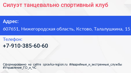 Силуэт, танцевально-спортивный клуб по адресу 607651, Нижегородская область, Кстово, Талалушкина, 15 в дальнейшем Организация, размещена в следующих категориях: