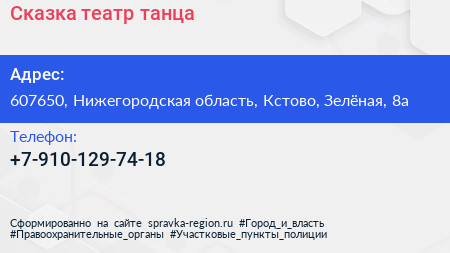 Сказка, театр танца по адресу 607650, Нижегородская область, Кстово, Зелёная, 8а в дальнейшем Организация, размещена в следующих категориях: