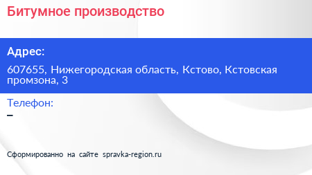 Битумное производство по адресу 607655, Нижегородская область, Кстово, Кстовская промзона, 3 в дальнейшем Организация, размещена в следующих категориях: