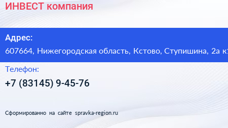 ИНВЕСТ, компания по адресу 607664, Нижегородская область, Кстово, Ступишина, 2а к1 в дальнейшем Организация, размещена в следующих категориях: