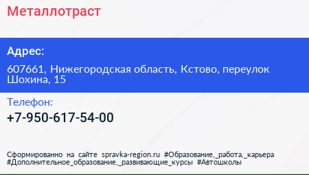 Металлотраст по адресу 607661, Нижегородская область, Кстово, переулок Шохина, 15 в дальнейшем Организация, размещена в следующих категориях: