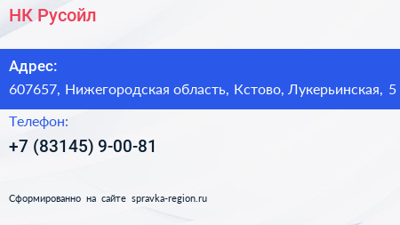 НК Русойл по адресу 607657, Нижегородская область, Кстово, Лукерьинская, 5 в дальнейшем Организация, размещена в следующих категориях: