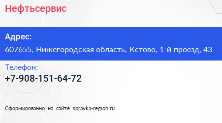 Нефтьсервис по адресу 607655, Нижегородская область, Кстово, 1-й проезд, 43 в дальнейшем Организация, размещена в следующих категориях:
