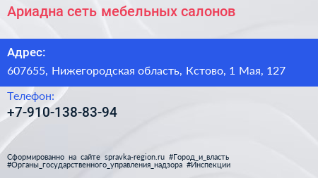 Ариадна, сеть мебельных салонов по адресу 607655, Нижегородская область, Кстово, 1 Мая, 127 в дальнейшем Организация, размещена в следующих категориях: