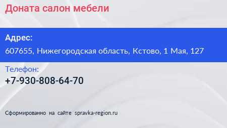 Доната, салон мебели по адресу 607655, Нижегородская область, Кстово, 1 Мая, 127 в дальнейшем Организация, размещена в следующих категориях:
