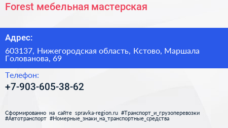 Forest, мебельная мастерская по адресу 603137, Нижегородская область, Кстово, Маршала Голованова, 69 в дальнейшем Организация, размещена в следующих категориях: