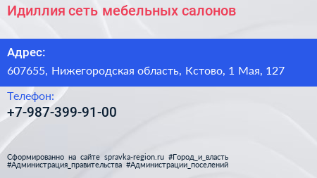 Идиллия, сеть мебельных салонов по адресу 607655, Нижегородская область, Кстово, 1 Мая, 127 в дальнейшем Организация, размещена в следующих категориях: