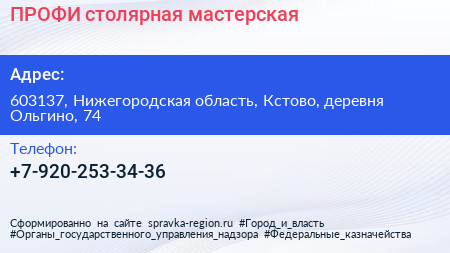 ПРОФИ, столярная мастерская по адресу 603137, Нижегородская область, Кстово, деревня Ольгино, 74 в дальнейшем Организация, размещена в следующих категориях: