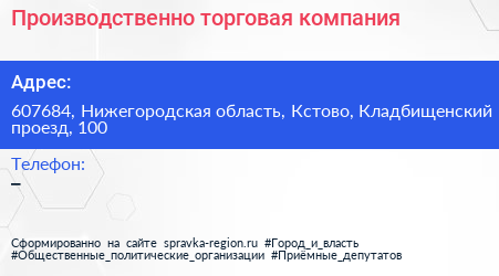 Производственно-торговая компания по адресу 607684, Нижегородская область, Кстово, Кладбищенский проезд, 100 в дальнейшем Организация, размещена в следующих категориях: