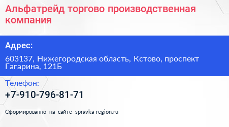 Альфатрейд, торгово-производственная компания по адресу 603137, Нижегородская область, Кстово, проспект Гагарина, 121Б в дальнейшем Организация, размещена в следующих категориях: