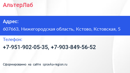 АльтерЛаб по адресу 607663, Нижегородская область, Кстово, Кстовская, 5 в дальнейшем Организация, размещена в следующих категориях: