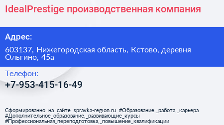 IdealPrestige, производственная компания по адресу 603137, Нижегородская область, Кстово, деревня Ольгино, 45а в дальнейшем Организация, размещена в следующих категориях: