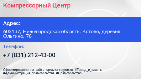 Компрессорный Центр по адресу 603137, Нижегородская область, Кстово, деревня Ольгино, 78 в дальнейшем Организация, размещена в следующих категориях: