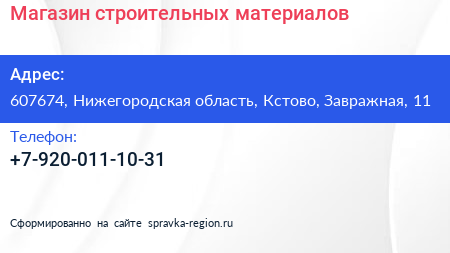 Магазин строительных материалов по адресу 607674, Нижегородская область, Кстово, Завражная, 11 в дальнейшем Организация, размещена в следующих категориях: