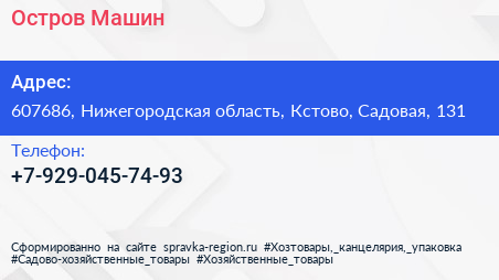 Остров Машин по адресу 607686, Нижегородская область, Кстово, Садовая, 131 в дальнейшем Организация, размещена в следующих категориях: