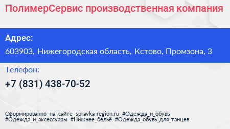 ПолимерСервис, производственная компания по адресу 603903, Нижегородская область, Кстово, Промзона, 3 в дальнейшем Организация, размещена в следующих категориях: