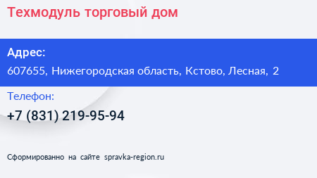 Техмодуль, торговый дом по адресу 607655, Нижегородская область, Кстово, Лесная, 2 в дальнейшем Организация, размещена в следующих категориях: