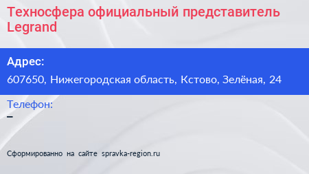 Техносфера, официальный представитель Legrand по адресу 607650, Нижегородская область, Кстово, Зелёная, 24 в дальнейшем Организация, размещена в следующих категориях:
