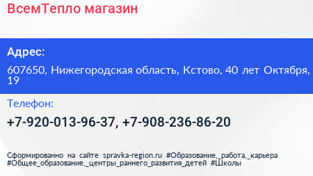 ВсемТепло, магазин по адресу 607650, Нижегородская область, Кстово, 40 лет Октября, 19 в дальнейшем Организация, размещена в следующих категориях: