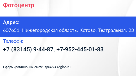 Фотоцентр по адресу 607651, Нижегородская область, Кстово, Театральная, 23 в дальнейшем Организация, размещена в следующих категориях: